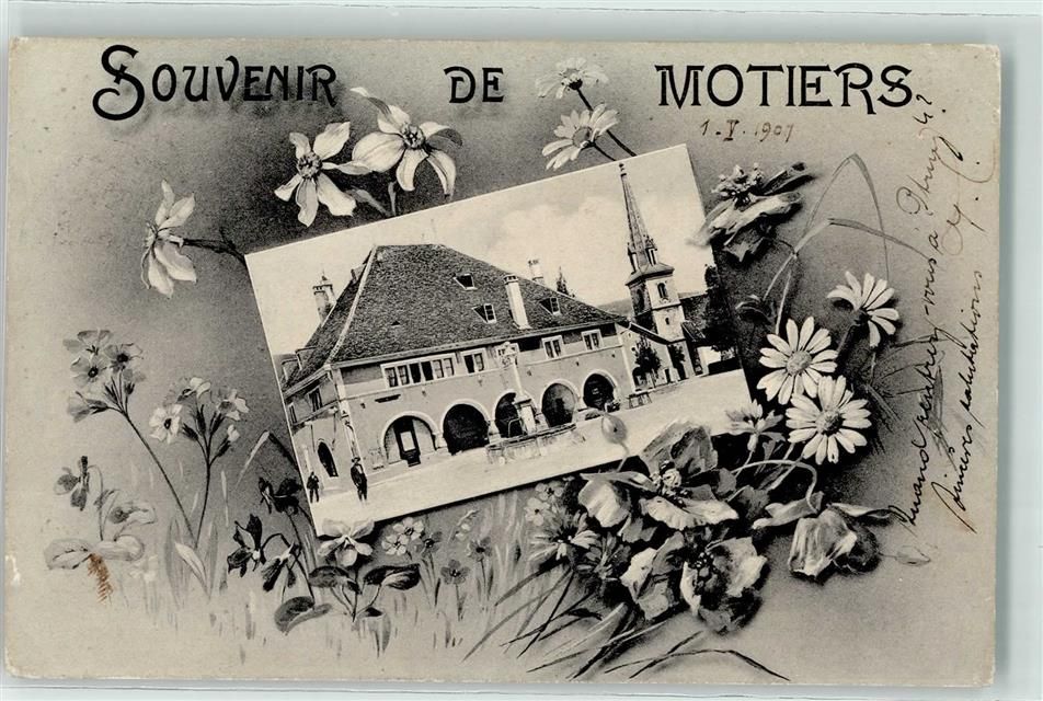 Môtiers NE, Brunnen Kirche Arkaden Blumen