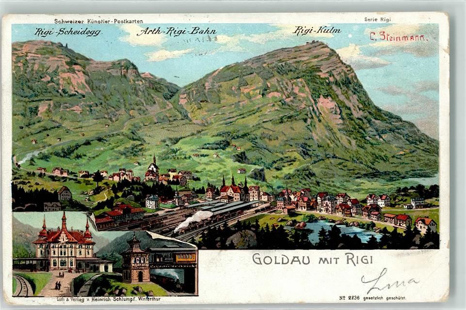 Goldau, sign. C. Steinmann Eisenbahn Kirche Rigi Kulm Arth Rigi Bahn Scheidegg