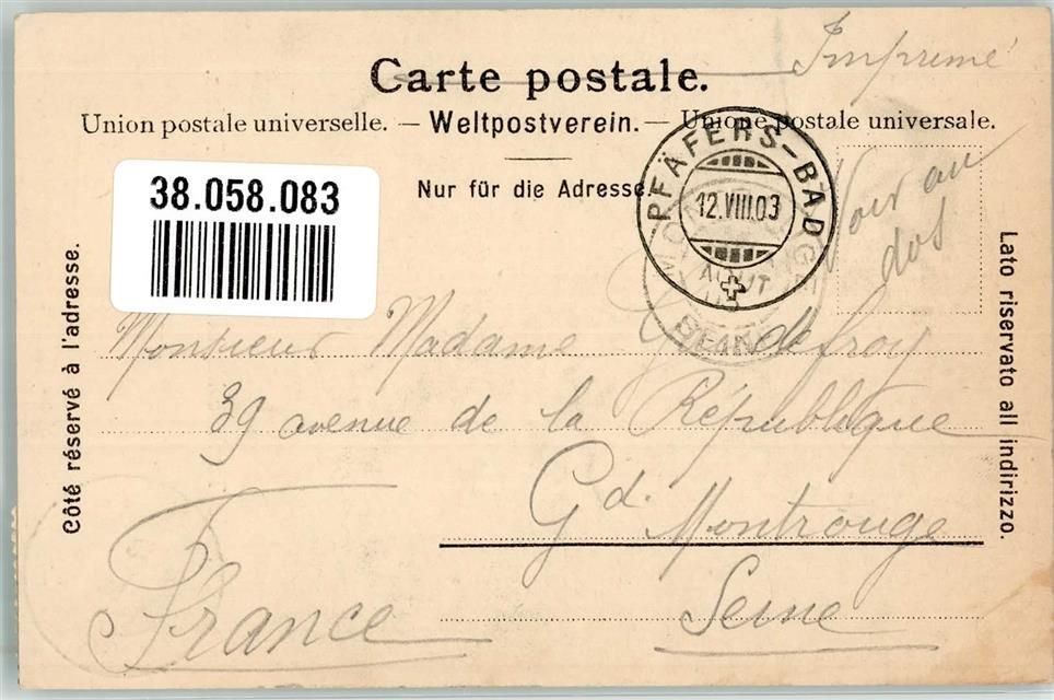 Pfäfers, Taminaschlucht Briefmarke Bildseite