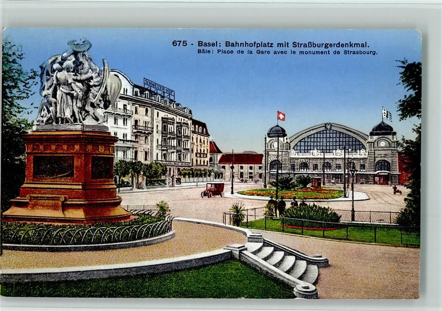 Basel Bâle Bahnhofplatz mit Strassburgerdenkmal Wappen Oldtimer Bahnhof Schweiz