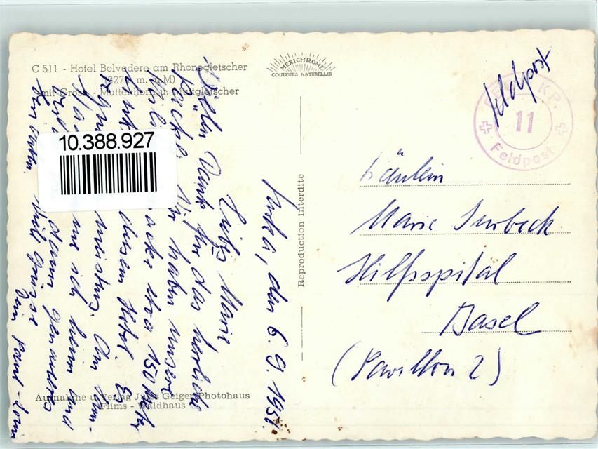 Belvedere 1957 - Feldpost Hotel Belvedere am Rhonegletscher mit Grossmutterhorn und Muttletscher Oldtimer