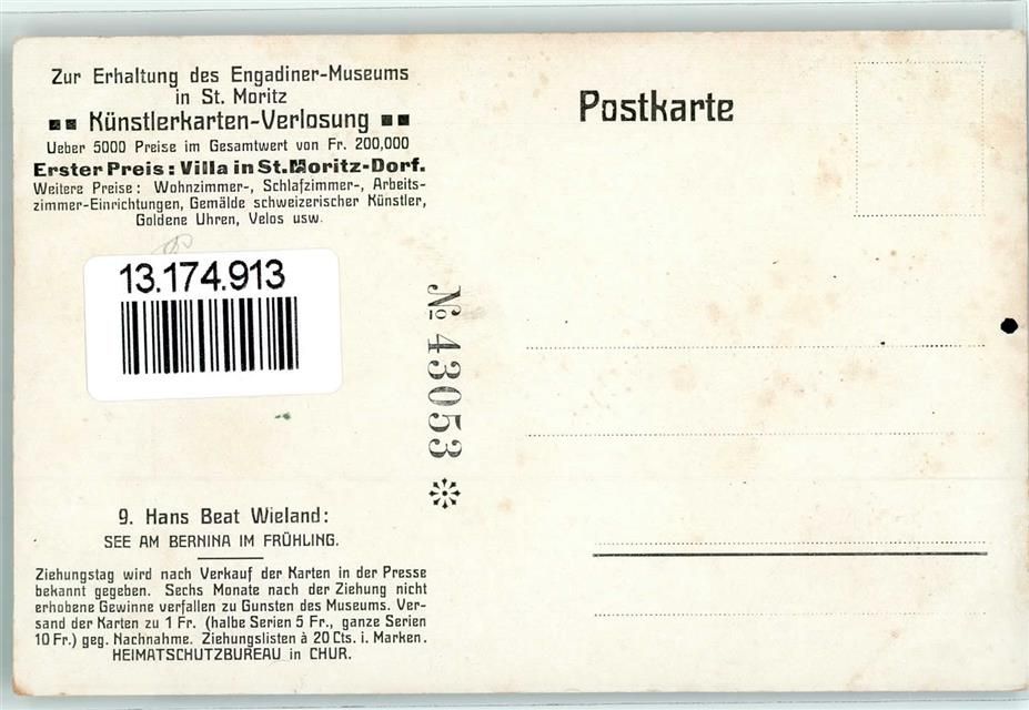 Bernina Künstlerkarte See am Bernina im Frühling sign Hans Beat Wieland Nr 9 Rückseite Los-Nummer 43053