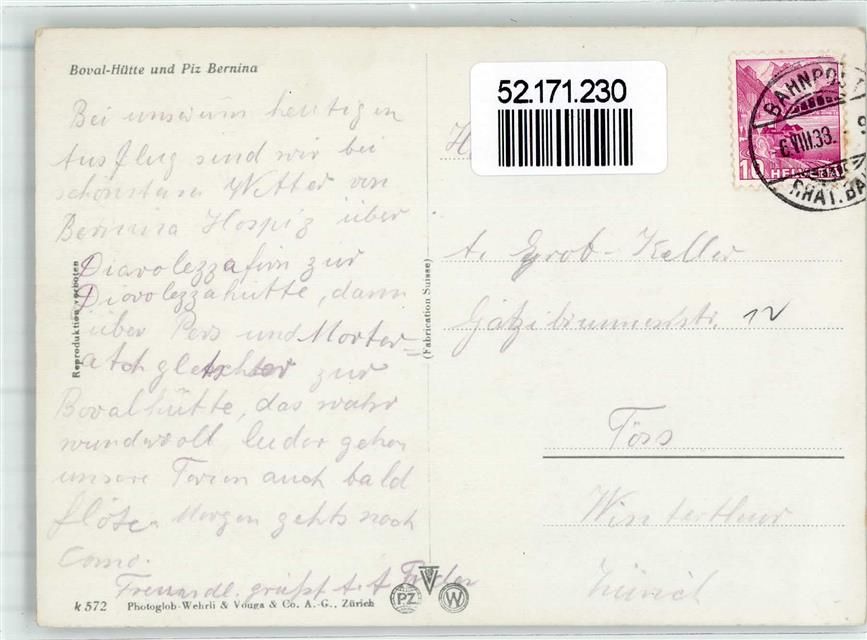 Bovalhütte 1933 - Bahnpost Räthische Bahn Gasthaus
