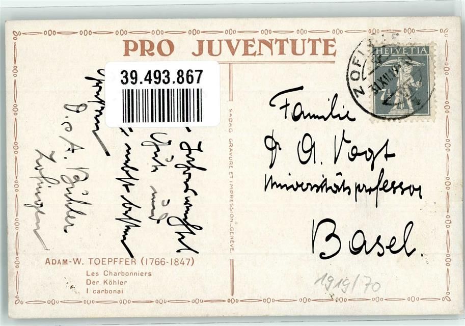 Der Köhler sign. A.-W. Töpffer Nr. 70 Pferde Schlitten Winter Pro Juventute Schweiz 1919 Künstlerkarte