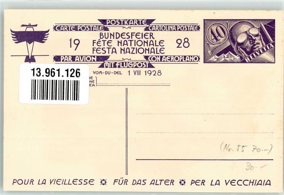 Flugpost Bundesfeier 1928 für das Alter sign. Ed. Renggli Bundesfeier Ganzsachen Schweiz Künstlerkarte