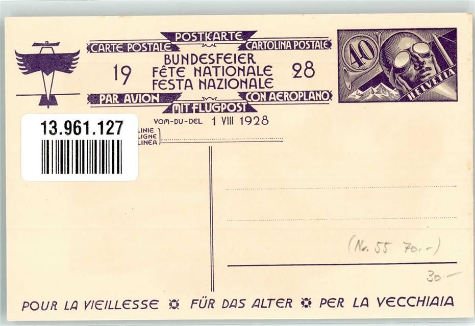 Flugpost Bundesfeier 1928 für das Alter sign. Ed. Renggli Bundesfeier Ganzsachen Schweiz Künstlerkarte