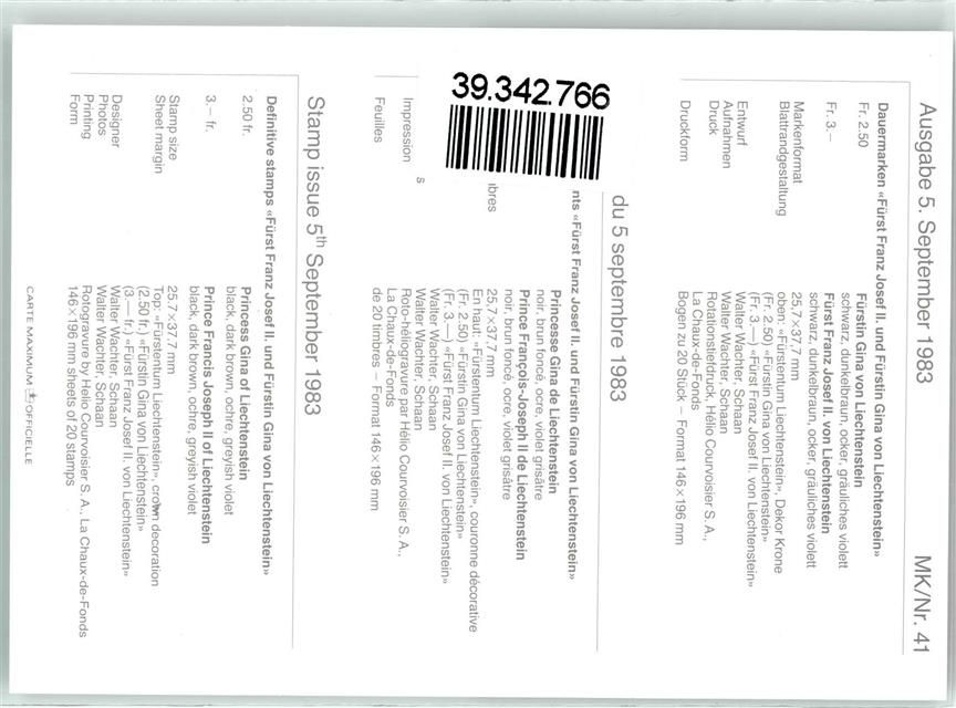 Fürst Franz Josef II. von Liechtenstein Ausgabe 5. September 1983