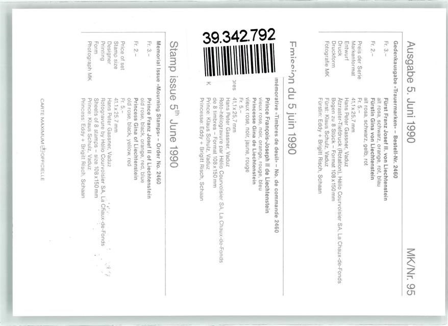 Fürstin Gina Gedenkausgabe Trauermarken 5. Juni 1990 Adel Liechtenstein