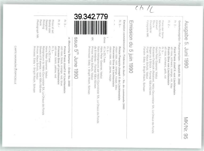 Fürstin Gina Gedenkausgabe Trauermarken Ausgabe 5. Juni 1990 Adel Liechtenstein