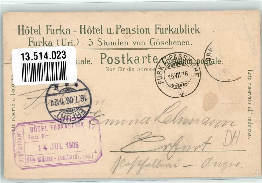 Furka 1906 Gebrauchsspuren Hotel Furka Lithographie Hüttenstempel