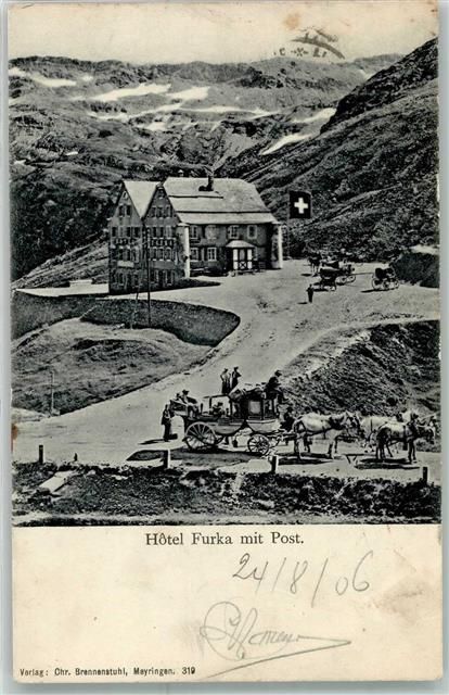 Furka 1906 - Hotel Furka mit Post Postkutsche