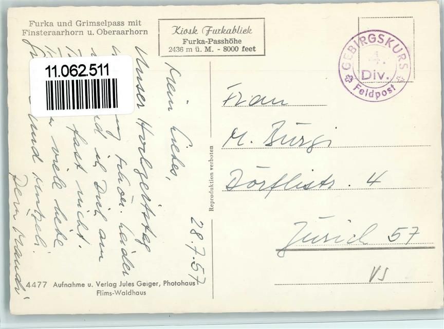 Furka - Furka und Grimselpass mit Finsteraarhorn und Oberaarhorn Feldpost
