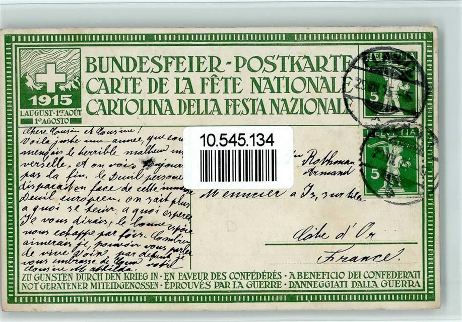 Ganzsache 1915 - Helvetia mit Flüchtlingen Bundesfeier Ganzsachen Schweiz Künstlerkarte