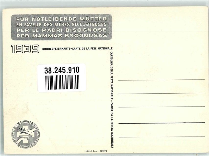 Genève, Bundesfeiertkarte 1939 für Notleidende Mütter