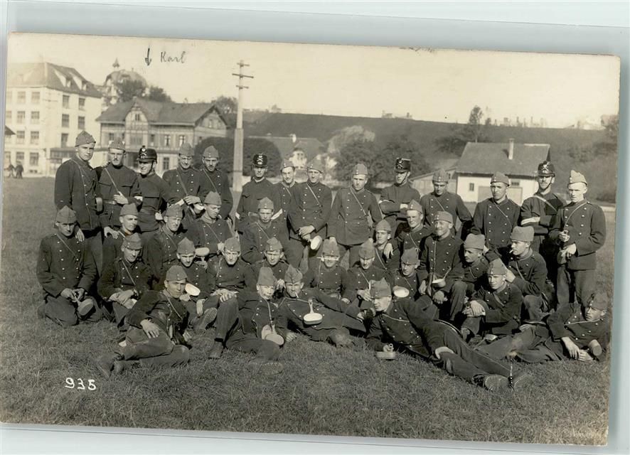 Gruppe Schweizer Soldaten vor dem Essen fassen PrivatfotoAK Militär Schweiz Gebrauchsspuren