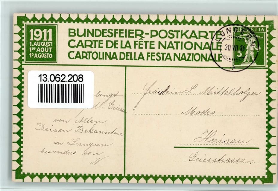 Karte von 1911 - gute Erhaltung Bundesfeier Ganzsachen Schweiz Lithographie / Künstlerkarte
