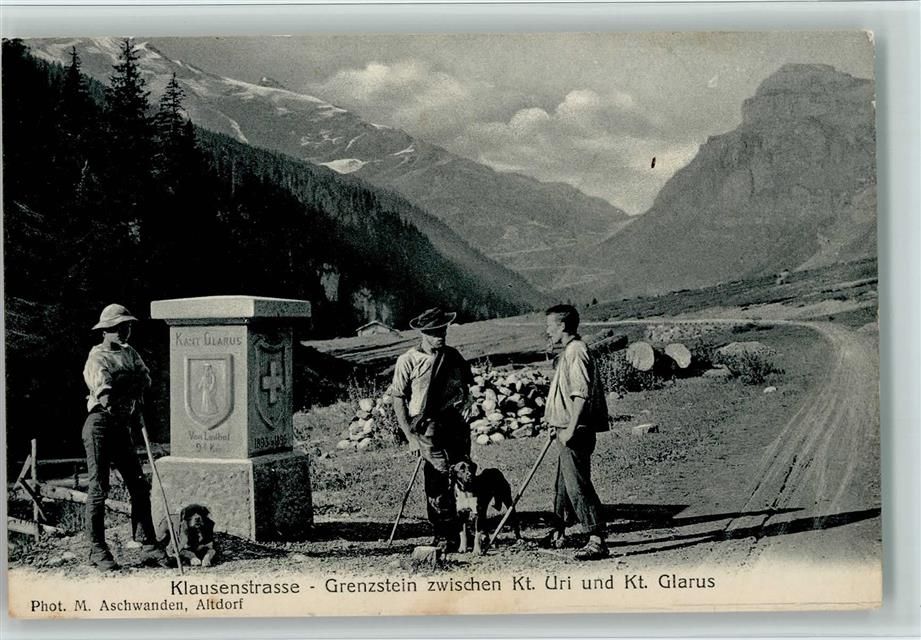 Klausenstrasse, Klausenstrasse, Grenzstein Zwischen Uri und Glarus , Bauern mit Hunden, gute Erhaltung AK
