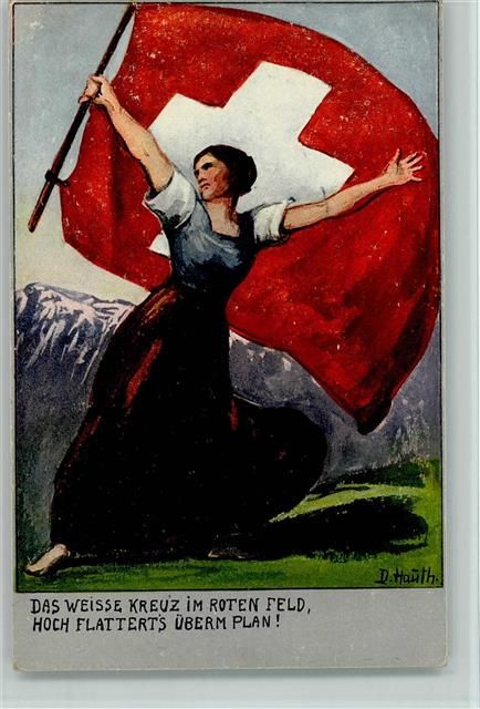 , Das weisse Kreuz im roten Feld, Frau schwengt die Fahne, sign Hauth
