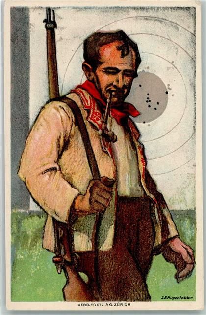 Künstlerkarte Schweizerischer Schützenverein Societa Svizzera dei Carabinieri Mann mit Gewehr Zielscheibe sign J. E. Hugentobler