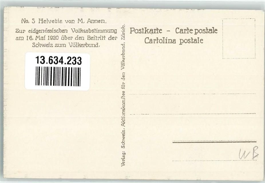 , sign Annen M. Nr 3 Helvetia Zur eidgenössichen Volksabstimmung 16. Mai 1920 über den Beitritt zum Völkerbund