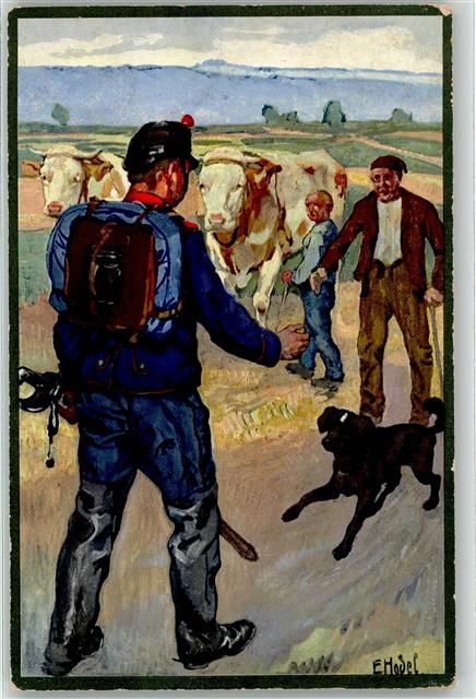 Künstlerkarte sign. Hodel, E. Soldat Kuh Hund