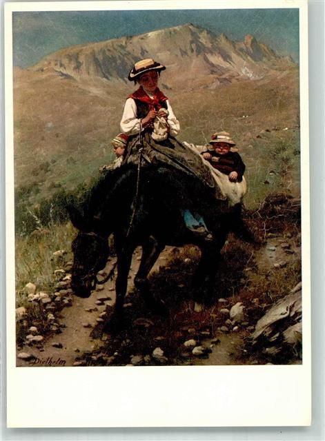 Künstlerkarte Walliserin mit zwei Kindern Esel sign. Meyer Carl Diethelm