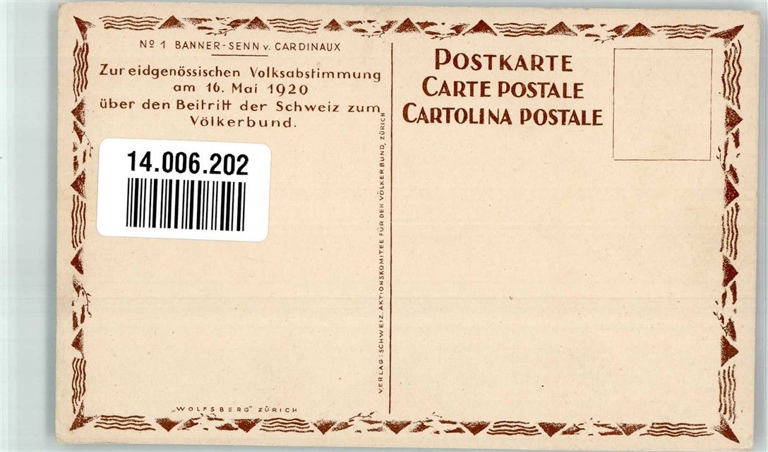 Lithographie Ja, dem Beitritt derr Schweiz zum Völkerbund Volksabstimmung 1920