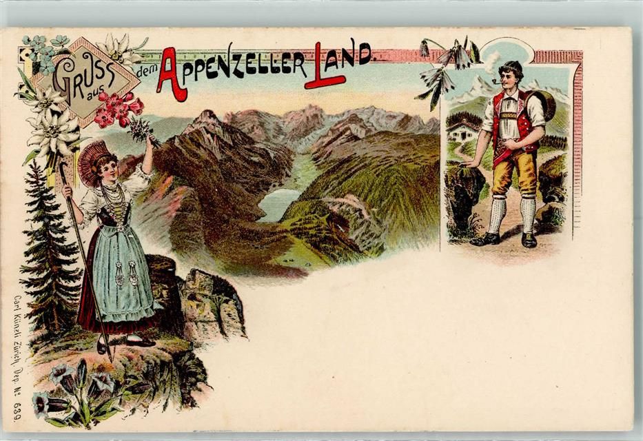 Lithographie Trachten Kuhhirte Edelweiss Enzian