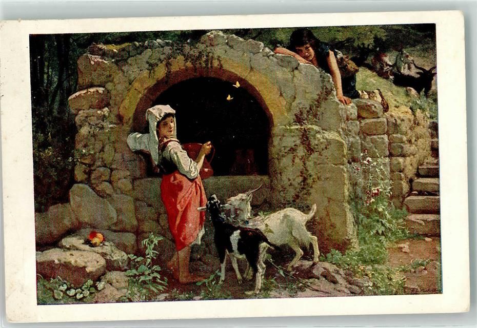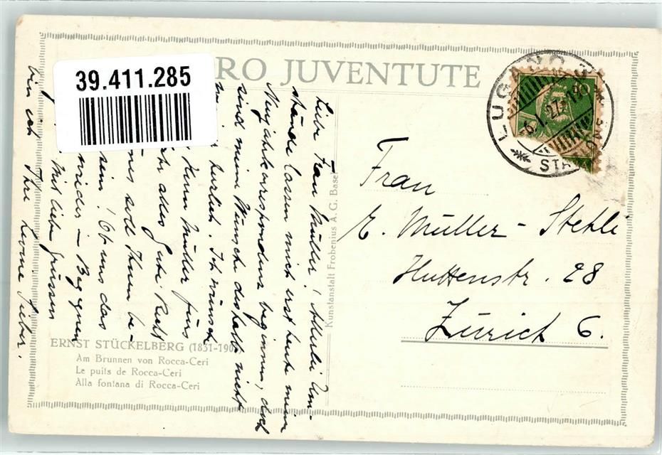 Lugano Am Brunnen von Rocca Ceri sign. Ernst Stückelberg Ort lt. Stempel Pro Juventute Schweiz 1927