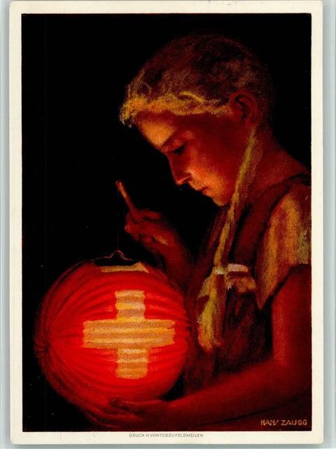 Mädchen mit Laterne sign. Hans Zaugg Für die Bekämpfung der Tuberkulose Bundesfeier Ganzsachen Schweiz 1936 Künstlerkarte