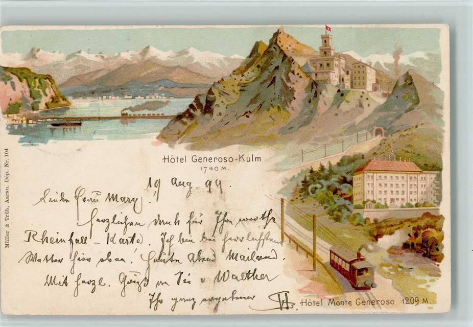 Monte Generoso 1899 Lithographie / Künstlerkarte Gruss aus - Hotel Monte Generoso, Bergbahn, Verlag Müller & Trüb Nr. 104 AK