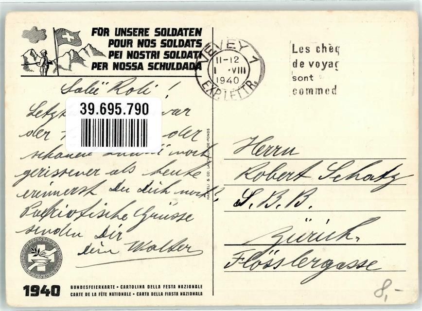sign. Eplattenier Bundesfeierkarte 1940 Für unsere Soldaten Bundesfeier / Pro Patria Schweiz Gebrauchsspuren