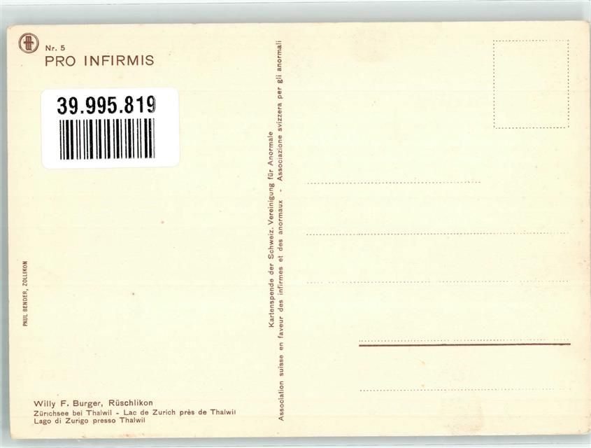 Thalwil sign. Burger Willy Rüschlikon Zürichsee Pro Infirmis Schweiz Künstlerkarte