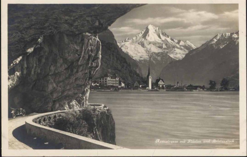 um 1920/30 - Flüelen, Kt. Uri, Schweiz, Axenstraße mit Flüelen und Bristenstock, See, Kirche, Bergmassiv,E. Götz AKU1