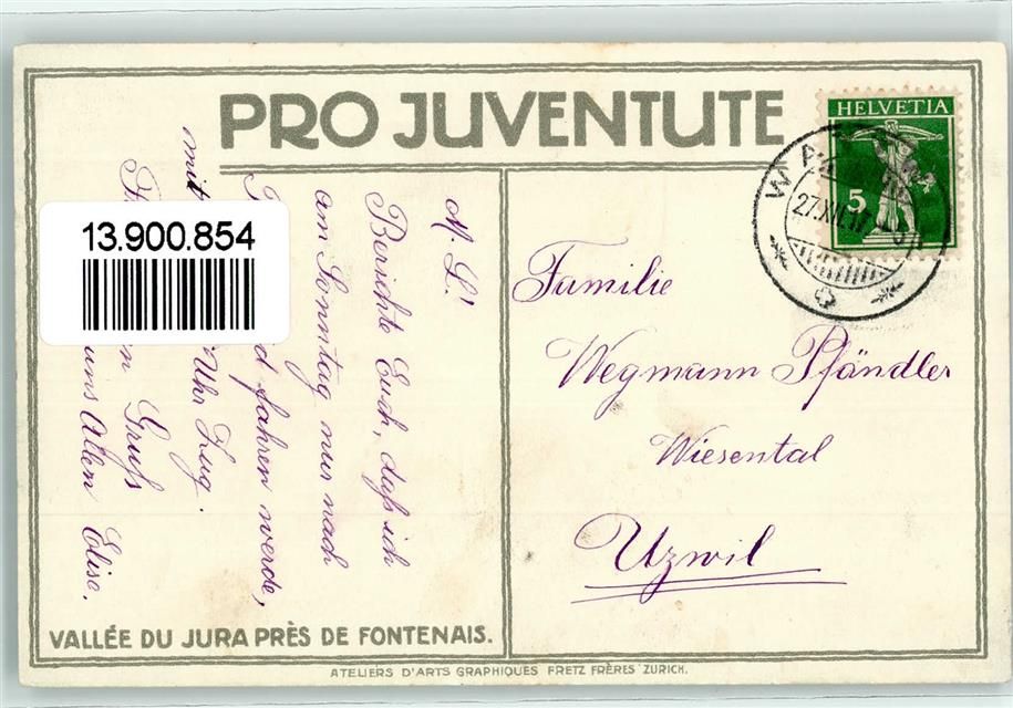 Vallee du Jura pres de Fontenais sign E. Schlatter Pro Juventute Schweiz 1917 Künstlerkarte