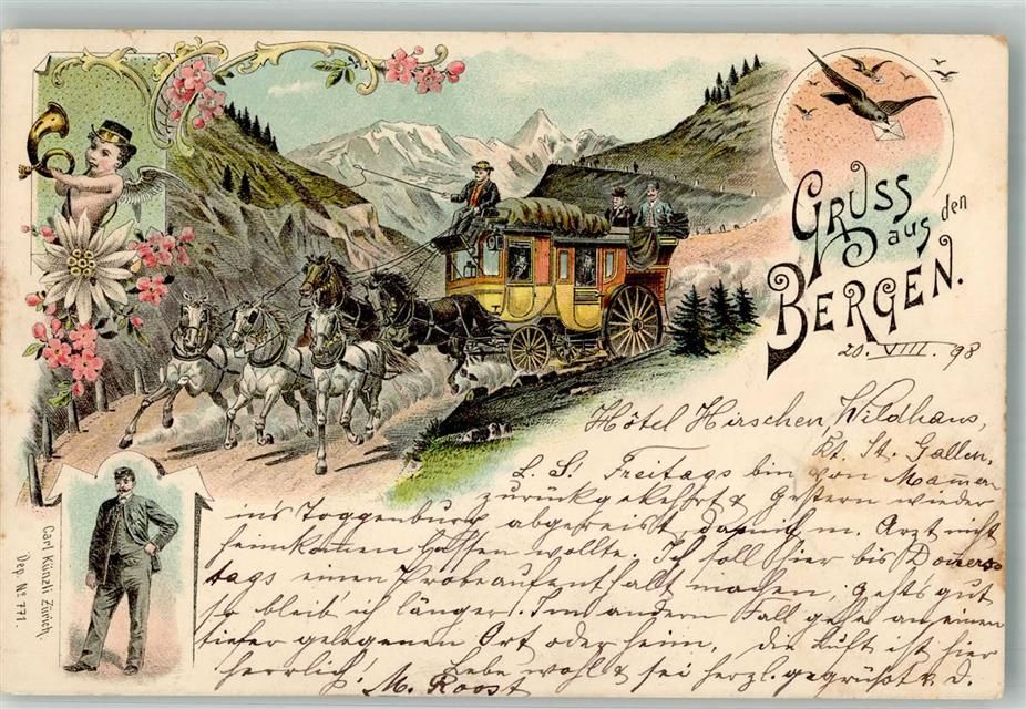 Verlag Künzli Dep. Nr. 771 Posthorn Gruss aus den Bergen Postkutsche Schweiz 1898 Lithographie / Künstlerkarte