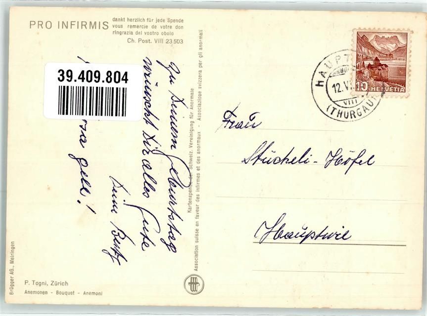 Zürich Anemonen Bouquet sign. P Togni Ort laut Künstler Pro Infirmis Schweiz Künstlerkarte