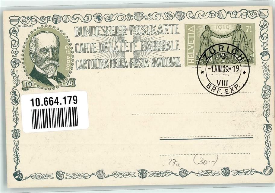 Zürich Bundesfeier Portrait Gottfried Keller 1889 Ort lt. Stempel Bundesfeier Ganzsachen Schweiz 1919 Künstlerkarte