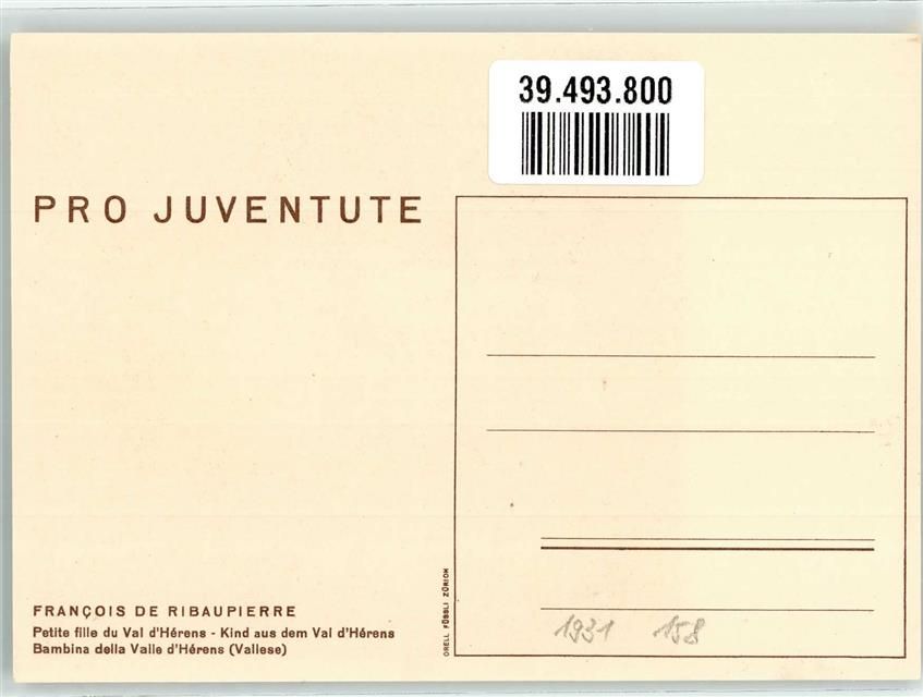 Zürich sign. F. de Ribaupierre Kind aus dem Val d´Herens Künstlerkarte Ort lt. Verlag Pro Juventute Schweiz