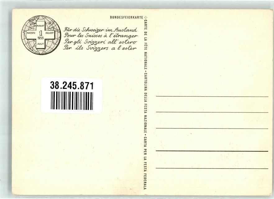 Zürich, sign. Hodler, F. Beruf Bauer Bundesfeierkarte 1953
